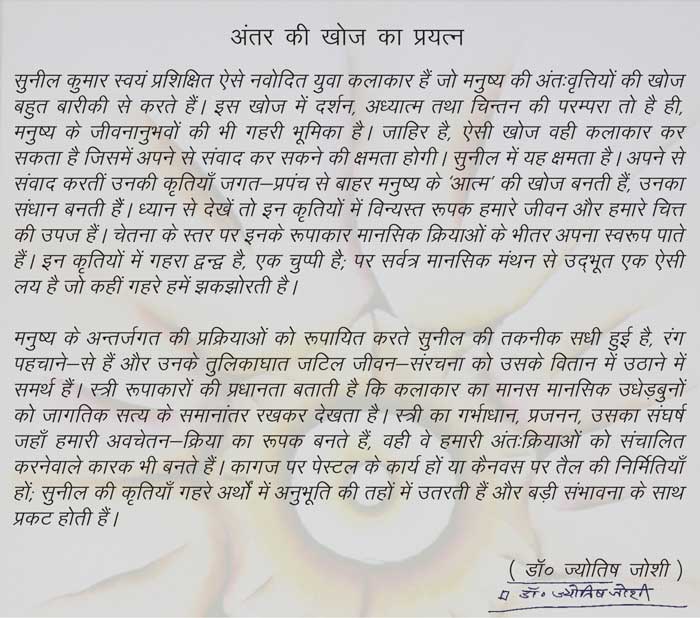 An Effort to Discover the Inner World Sunil Kumar is one such self -taught upcoming artist who explores the inner processes very minutely. This research follows for sure the tradition of spiritual observation and meditation; it also deeply involves life-experiences. Obviously, such research work is in the power of those who can communicate with him or herself. Sunil has got this power. Talking to themselves, his works happen to be a discovery of self, a union with self, away from mundane affairs and illusions. On close observation we see that the forms constructed in these works are crops from our mind, our psyche. On the level of consciousness his forms and figures find their take shape through mental processes. There is a profound duality and conflict in these works, a certain silence; but emerging through mental churning there is a rhythm that shakes us to unknown depths. While depicting the processes of human inner world his is a mature technique, fully at his command; colours very much familiar (to him); and brush-strokes capable of carrying the life structure to the height of its perfection. Dominance of female figures say that the artist’s mind sees mental scrutiny as closely influenced by the worldly truths. Whereas conception, birth, a woman’s struggles etc. happen to be the target of our sub-conscious figurative representation they also are their controlling factors. Whether it is pastel on paper or oil on canvas, his works go deep down to the core of feelings and experiences; and appear very potent and promising.) —Dr. Jyotish Joshi |